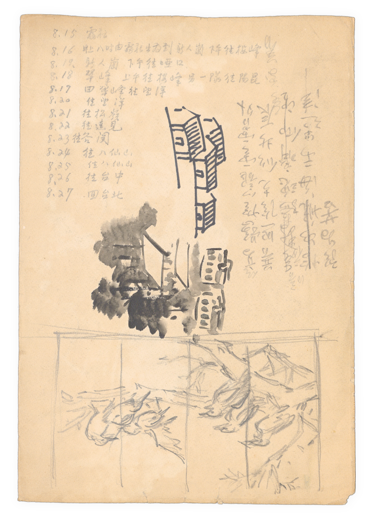 林玉山臺灣寫生地圖與足跡主要分成「臺灣寫生地圖」與「臺灣寫生足跡」兩個部分呈現,「臺灣寫生地圖」是根據其寫生稿內容分成地點風景、離島、山岳、海岸、泉溪河瀑布等五大主題,本次展覽透過資料視覺化方式呈現林玉山在臺灣駐足之寫生地點之外,更提供Google實景地圖作為參照,觀察寫生景點今昔之差異,且在操作同時,能即時聆聽「臺灣聲景協會」錄製之臺灣島嶼聲音,滿足視、聽覺之感受;「臺灣寫生足跡」則是以林玉山寫生稿行程記錄〈橫貫公路行程表〉為代表路線,跟隨文字紀錄及寫生稿之引導,一步步走訪、體驗其寫生足跡。